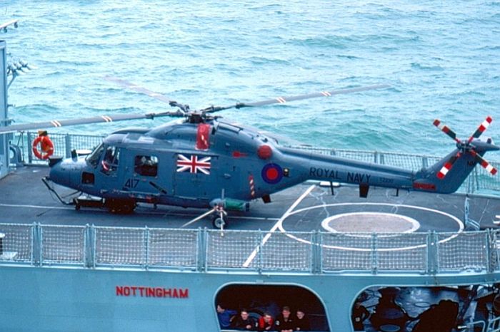 一架停在Type 42驅逐艦諾丁漢號(HMS Nottingham D91)的大山貓HAS.3直昇機。此時前起落架被輔助降落系統的