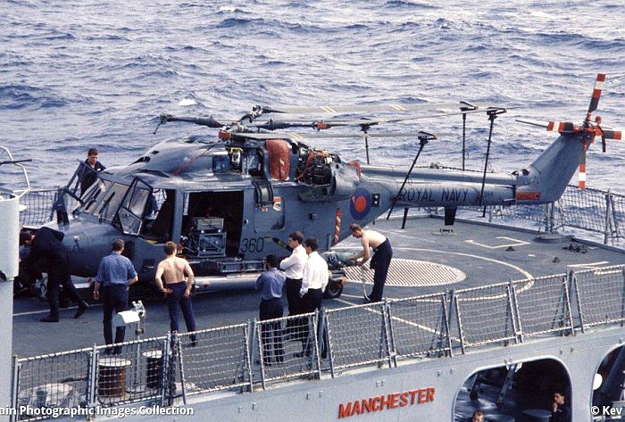 一架停在Type 42驅逐艦曼徹斯特號(HMS Manchester D95)的大山貓HAS.3反潛直昇機,此時發動機外罩