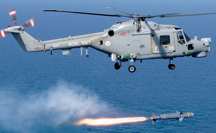 一架大山貓HMA.8發射一枚海賊鷗反艦飛彈。