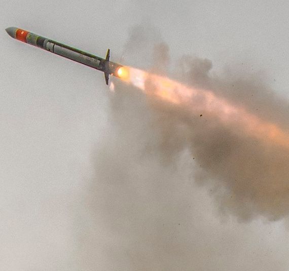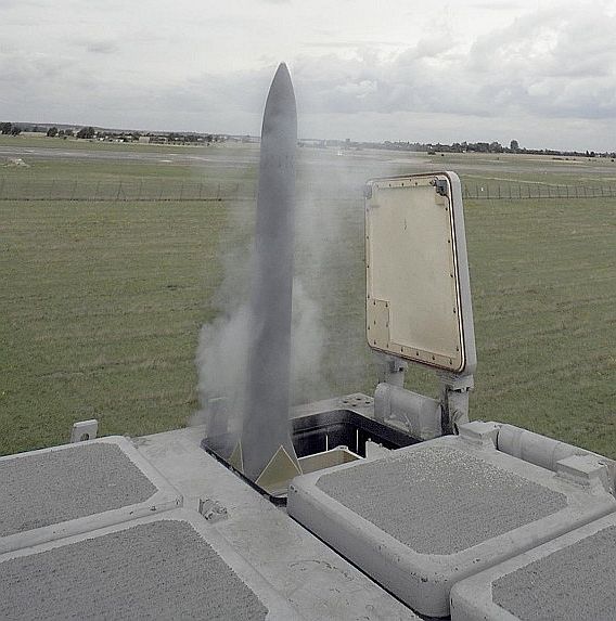 陸基版CAMM飛彈垂直發射升空的畫面,拍攝瞬間飛彈剛被彈射升空, 尚未點火。