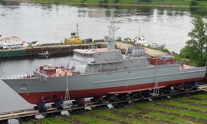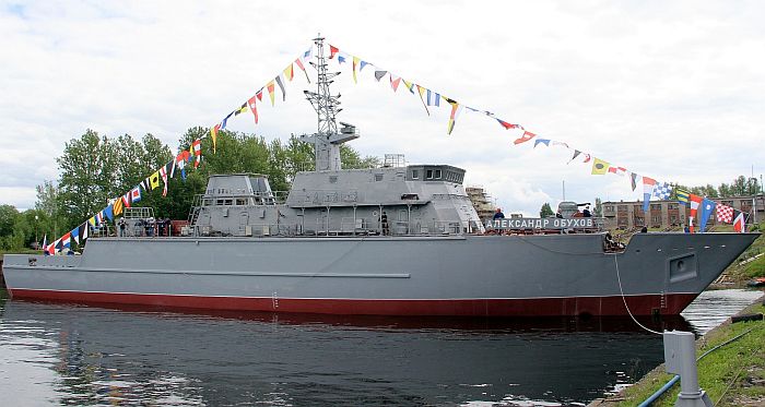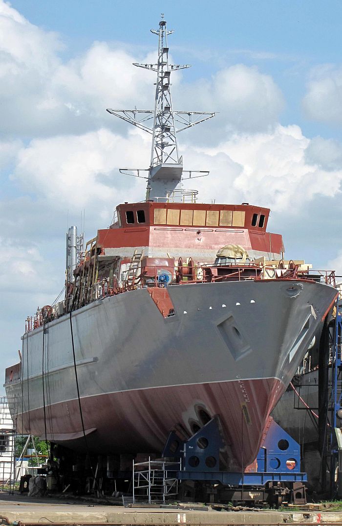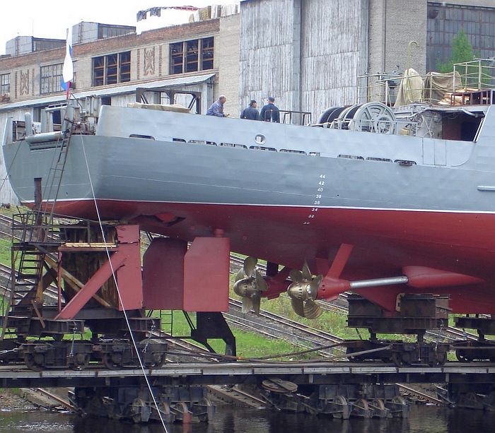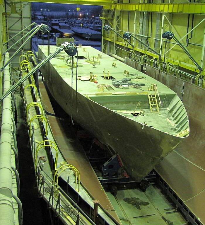 在模具設施灌注成形的艦體。此艦編號BT-730,命名為亞歷山大.奧布可夫號(Aleksandr Obukhov)