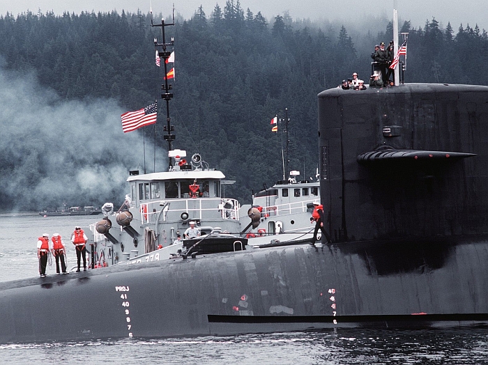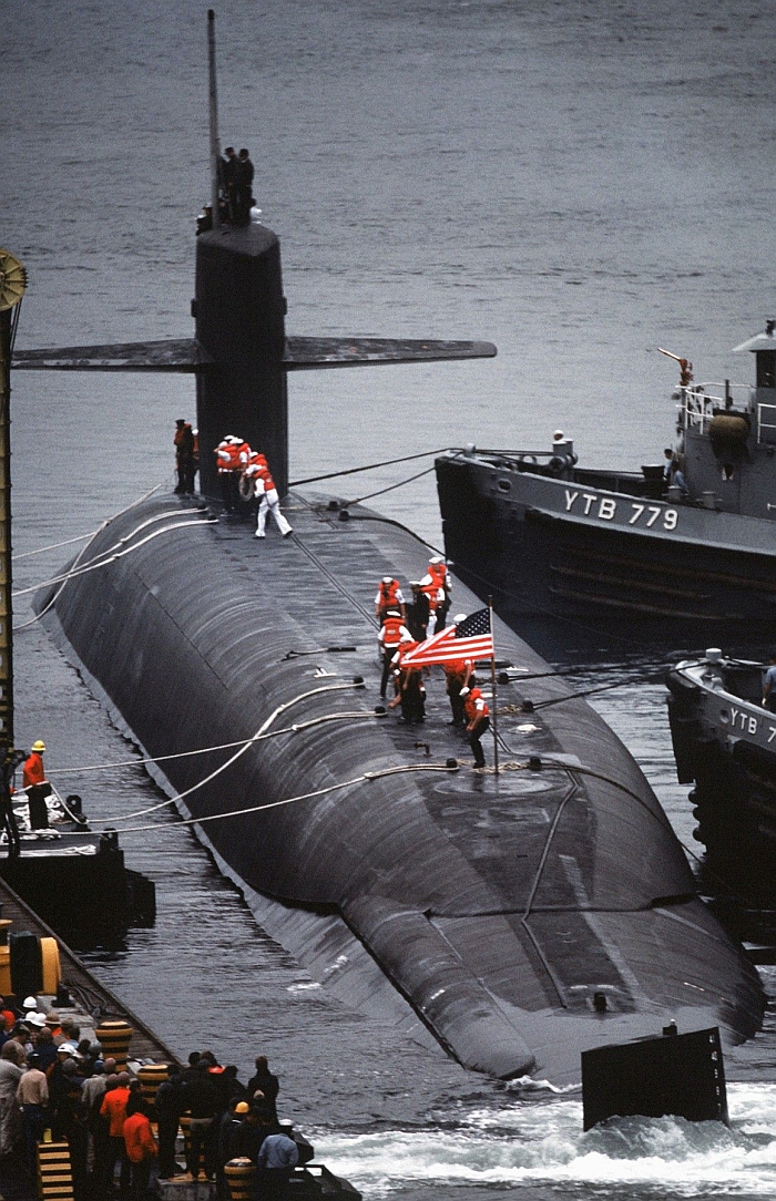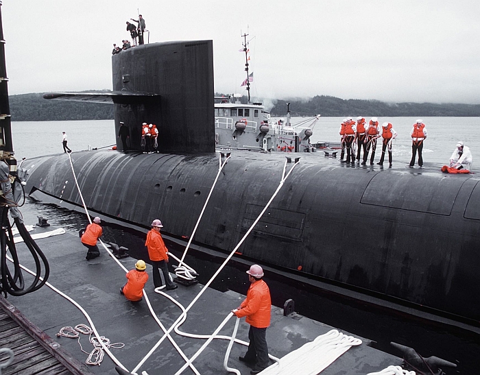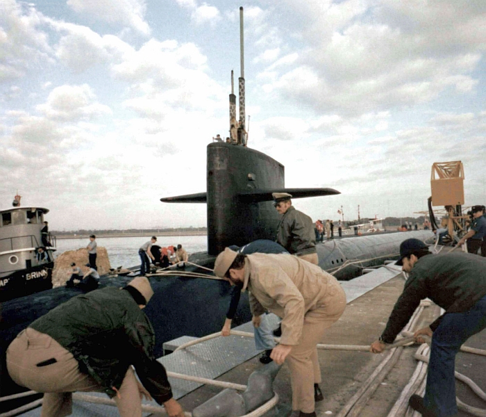 (上與下)俄亥俄級核能彈道飛彈潛艦首艦俄亥俄號(USS Ohio SSBN-726)正進行靠泊繫纜作業。攝於1982年。