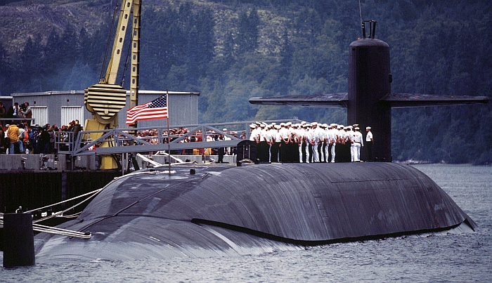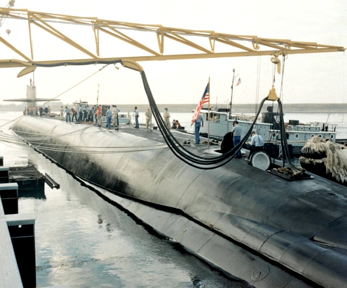 俄亥俄級核能彈道飛彈潛艦首艦俄亥俄號(USS Ohio SSBN-726)在碼頭整備補給的畫面。攝於1982年。