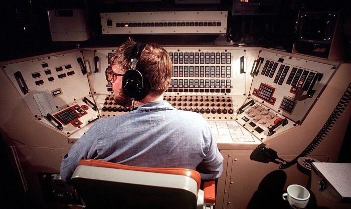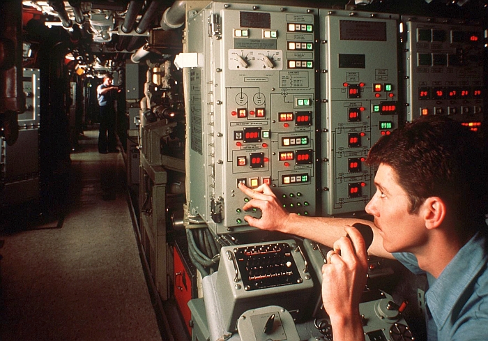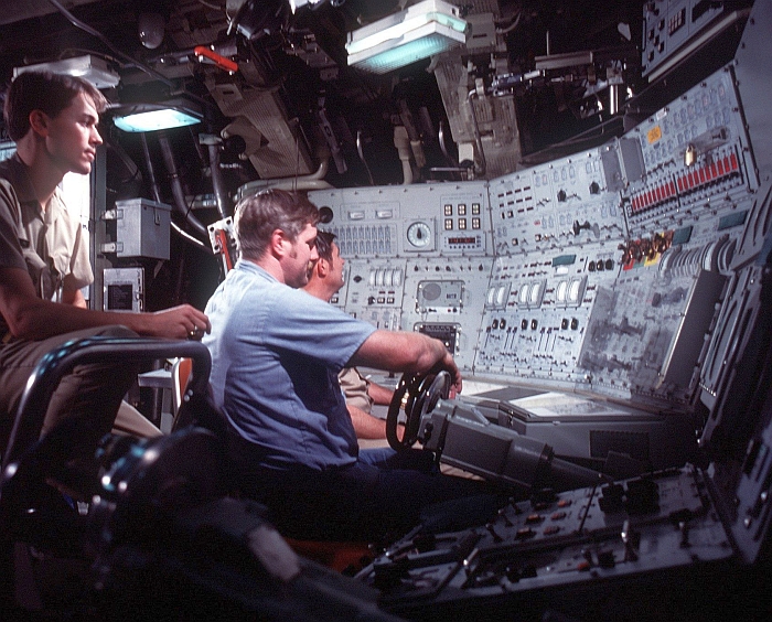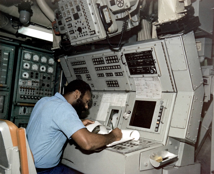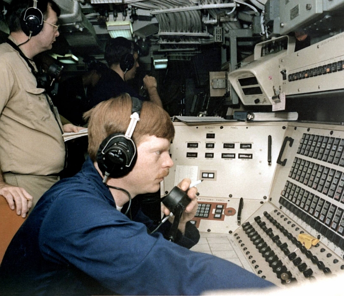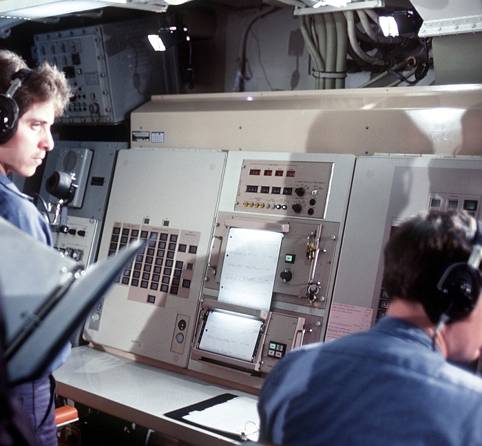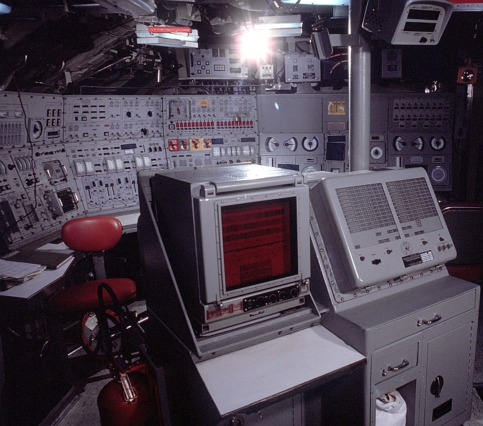 俄亥俄級核能彈道飛彈潛艦首艦俄亥俄號(USS Ohio SSBN-726)的航行操縱席。攝於1982年。
