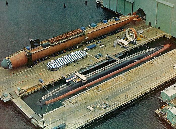 (SSBN-727)以及只有艦首拉出廠房的佛羅里達號(USS Florida SSBN-728)。此照片顯示當時通用電船業務