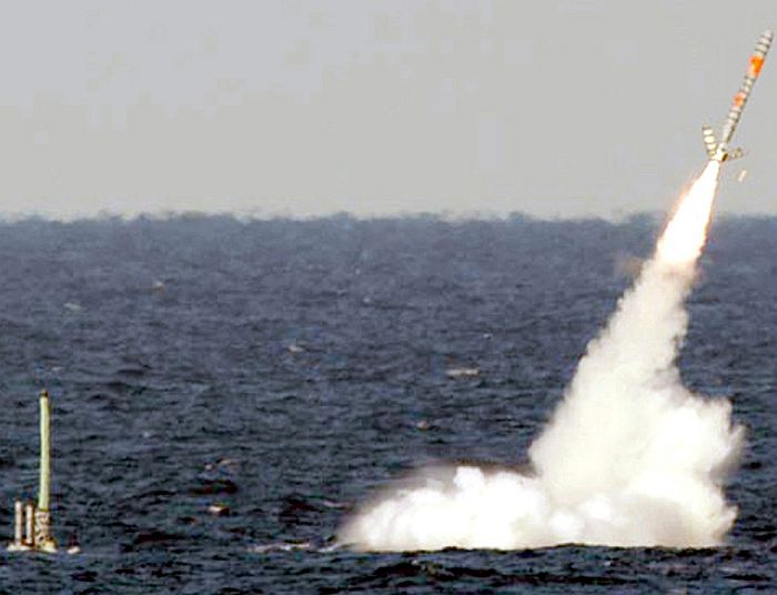一枚三叉戟 二型出水點火的瞬間。由於三叉戟飛彈在出水之後才點火,水下彈道不可控, 出水時巨大的潰滅壓力與負載會讓飛彈出現大角度傾斜,因此第一級火箭點火後需要以向量噴管 來修正飛彈姿態。