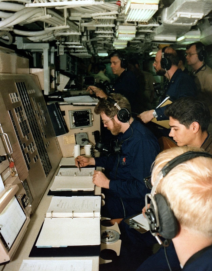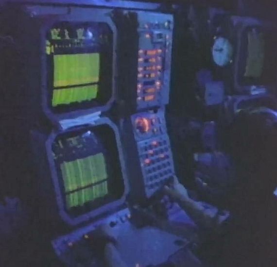 俄亥俄級核能彈道飛彈潛艦首艦俄亥俄號(USS Ohio SSBN-726)操控台的畫面。攝於1982年。