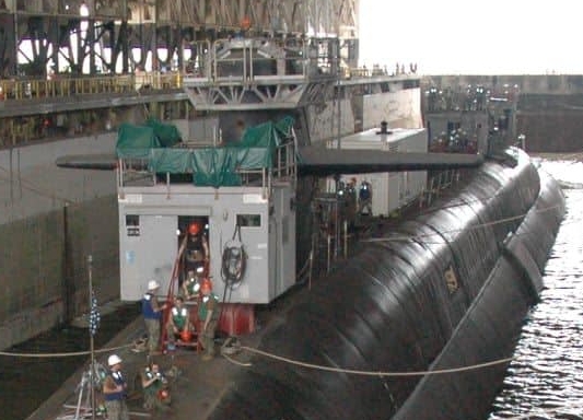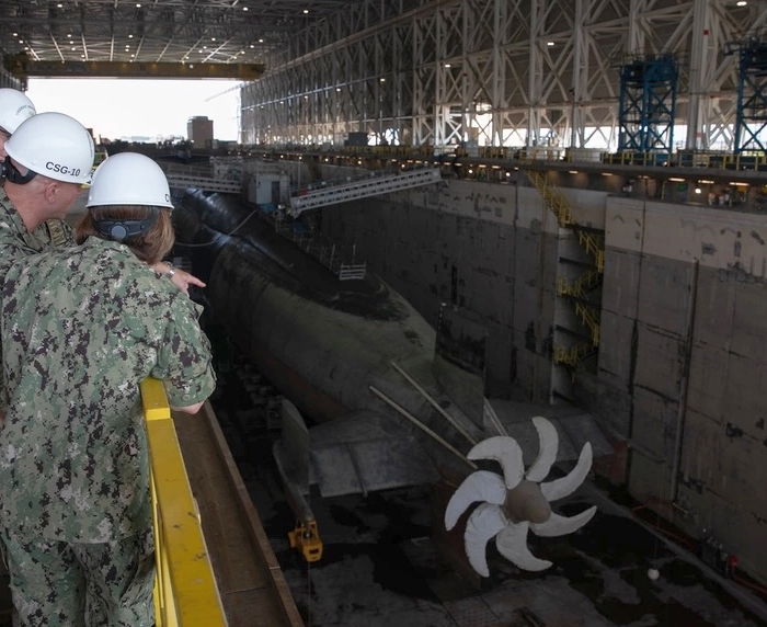 與第10潛艦群( Submarine Group 10)領導對談。此照片中,一艘俄亥俄級在船塢中進行維修,注意該艦