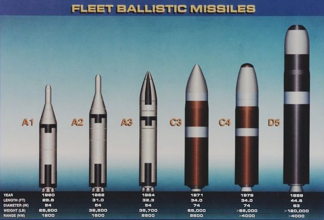 美國海軍潛射彈道飛彈的發展歷程,由左而又分別是北極星A1、A2、A3、海神C3、三叉戟C4與三叉戟二型D5。