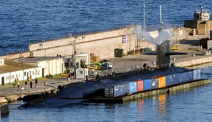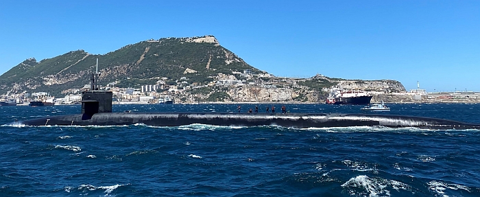喬治亞號(USS Georgia SSGN-729,右)停泊在直布羅陀皇家海軍基地進行整補。此時,俄羅斯入侵