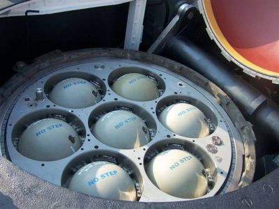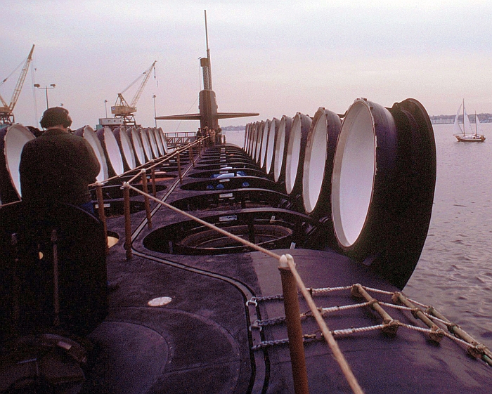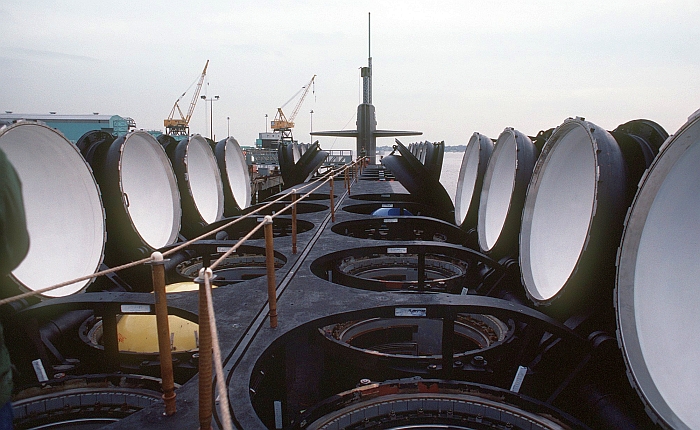 俄亥俄級敞開的24個彈道飛彈發射艙,已經全數填入D-5三叉戟二型洲際飛彈。
