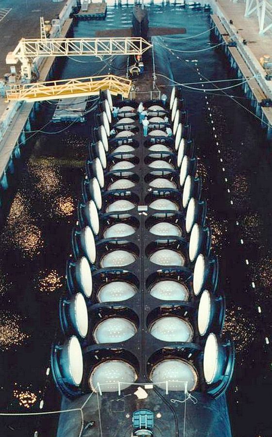 (上與下)俄亥俄級核能彈道飛彈潛艦首艦俄亥俄號(USS Ohio SSBN-726)彈道飛彈艙全數打開的畫面,攝於1982年。。