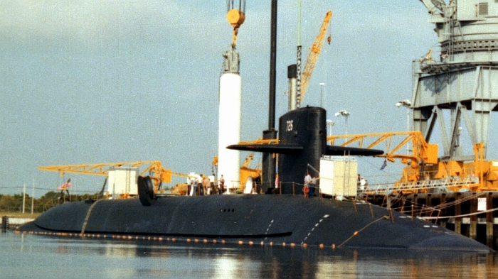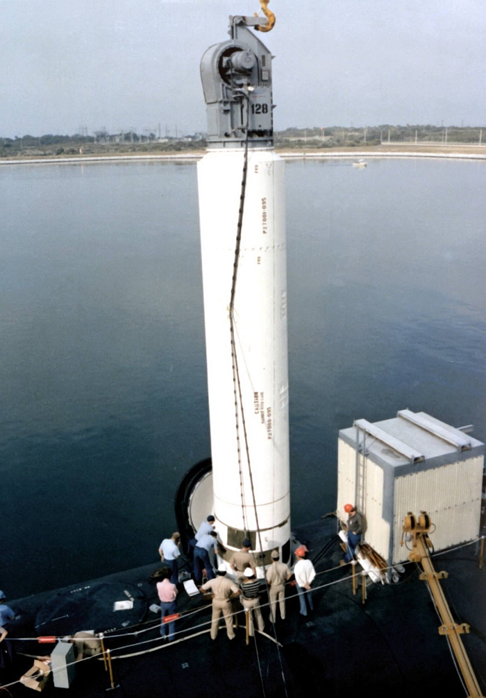(上與下)俄亥俄級核能彈道飛彈潛艦首艦俄亥俄號(USS Ohio SSBN-726)裝填三叉戟彈道飛彈的畫面,攝於1982年。