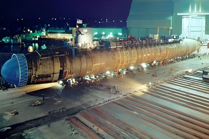 俄亥俄級首艦俄亥俄號(USS Ohio SSBN-726)在1979年首度從通用電船廠房中拉出,攝於1978年3月21日。