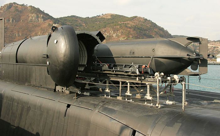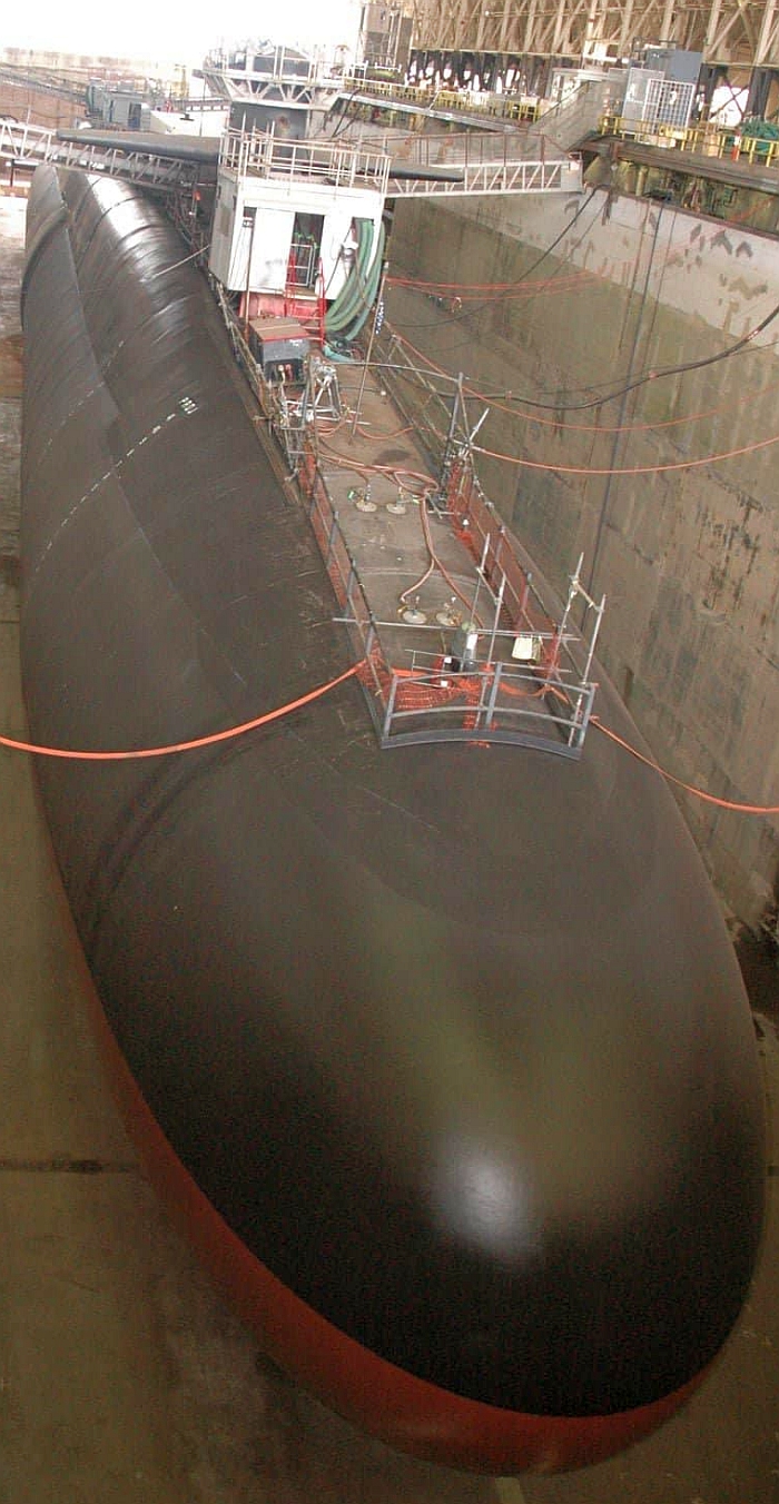 (上與下)田納西號(USS Tennessee SSBN-734)在延伸維修週期工程中, 艦體中部兩舷各加裝一個大型垂直聲納陣列(LVA),這是美國海軍聲學優勢 計畫發展的適型陣列聲納。