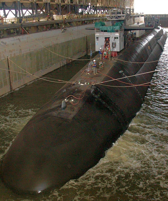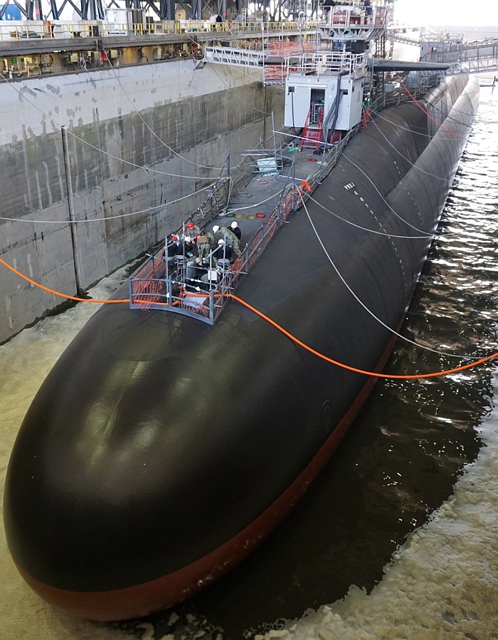 完成翻修工程的喬治亞號(USS Georgia SSGN-729)巡航飛彈潛艦正在進行船塢注水作業。
