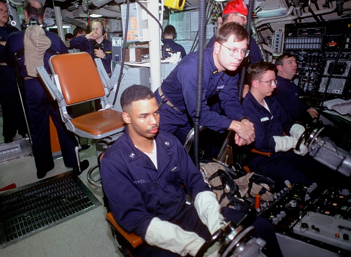 俄亥俄級賓夕法尼亞號(USS Pennsylvania SSBN-735)的控制室與航行操縱席。攝於1995年11月1日。