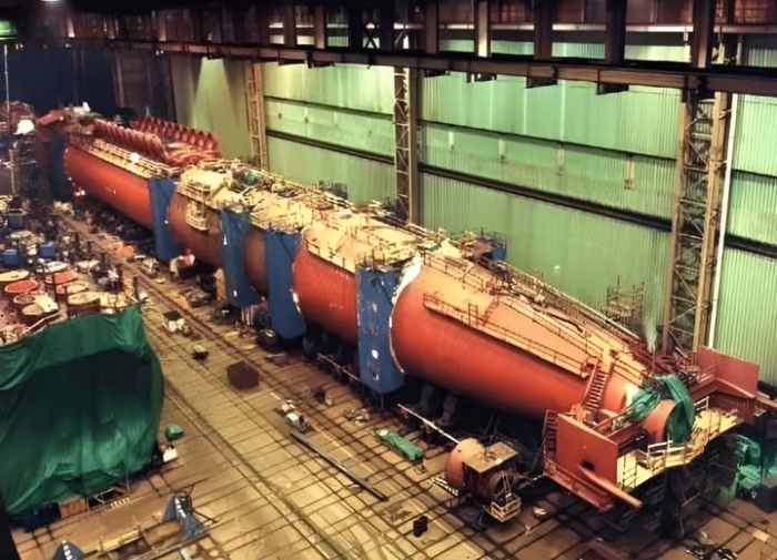 的畫面;左側是另一艘建造中的俄亥俄級的彈道飛彈分段。攝於1989年。