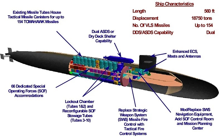 一艘俄亥俄級SSGN正在施放MK-8 SDV載具;注意該艦甲板上裝置兩個DDS艙, 每個艙容納一艘MK-8 SDV載具。 俄亥俄級SSGN艦 體背部能搭載兩個用來收容MK-8海豹輸泳載具( SEAL Delivery Vehicle,SDV)的乾式甲板換乘艙( Dry Deck Shelter,DDS,詳見富蘭克林級核能彈道飛彈潛艦一文),接在兩個由彈道飛彈發射管改裝的特戰任務艙之上;SEAL特戰小組人員透過SDV輸泳載具或橡皮艇從潛艦出發,潛入敵方海岸、離島執行偵察等特種任務然後返艦。 原本俄亥俄級SSGN還打算搭載先進海豹輸泳系統(Advanced SEAL Delivery System,ASDS,詳見維吉尼亞級核能攻擊潛艦一文),不過ASDS的發展計畫在2006年終止。在2017年起,MK-8 SDV陸續被更新型的MK-11 淺水域戰鬥潛航載具(Shallow Water Combat Submersible,SWCS)取代。 在2002年9月26日,美國海軍與通用電器船舶公司簽署4.429億美元的合約,為首艦俄亥俄號(USS Ohio SSBN-726)進行改裝 ;而俄亥俄級巡航飛彈潛艦在2002年度的進一步預算為3.55億美元,2003年度8.25億美元,2004年度9.36億美元,2005年度編列5.05億美元,2006年度則為1.7億美元,因此改裝四艘俄亥俄級的總經費約為7億美元。俄亥俄號在2002年11月停役回到通用電器船舶的船塢, 首先進行爐心更換作業,然後開始改裝,改裝完成後於2005年12月完成海上測試,在2006年2月7日重新就役;佛羅里達號(USS Florida SSN-728)則於2003年8月開始進行改裝,在2006年4月重回艦隊服役;而密西根號(USS Michigan SSBN-727)則在2003年11月開始改裝,2006年11月重回現役;喬治亞號(USS Georgia SSBN-729)在2004年10月開始改裝,2008年3月28日重回現役。 由於美國海軍現階段攻擊潛艦主力──後期型洛杉磯級核能攻擊潛艦即便把所有武器籌載空間都用來儲存戰斧飛彈,也不過是區區38枚的攜帶量,所以只要派遣少數改裝成SSGN的俄亥俄級大概就能滿足一場戰爭的戰斧飛彈需求量(2003年美國攻伊戰爭中,所有海軍水面/水下艦艇發射的戰斧飛彈總數約為400枚)。在2003年1月,佛羅里達號在一項名為巨人之影(Giant Shadow)的測試中搭載數型研發中的UUV、UAV以及特戰部隊,模擬一場特種作戰,而這些載具也將是海狼級三號艦吉米卡特號(USS Jimmy Carter SSN-23)與維吉尼亞級核能攻擊潛艦的裝備。在這次測試中,佛羅里達號曾以彈道飛彈發射管進行UUV的施放。
