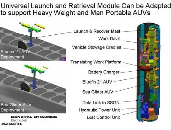美國海軍發展的通用發射回收模組(ULRM),可安裝在俄亥俄級 彈道飛彈潛艦的發射管以及維吉尼亞潛艦籌載模組(VPM),可用來儲存/施放 與回收各種無人載具,包括飛行載具(UAV)或水下載具(UUV)。此示意圖中, ULRM模組能同時容納同時容納一個藍鰭21(Bluefin 21)自航載具(AUV) 以及一個海滑翔者(Sea Glider)AUV。