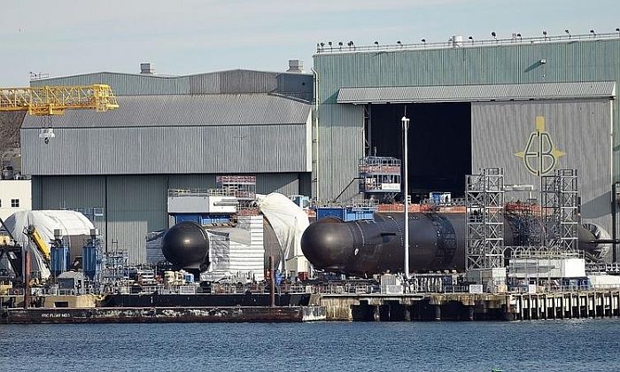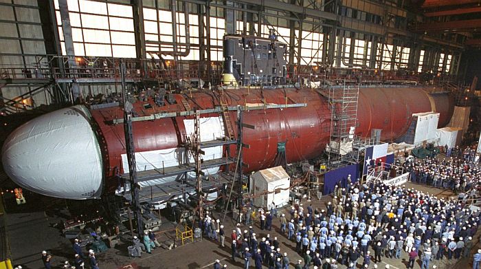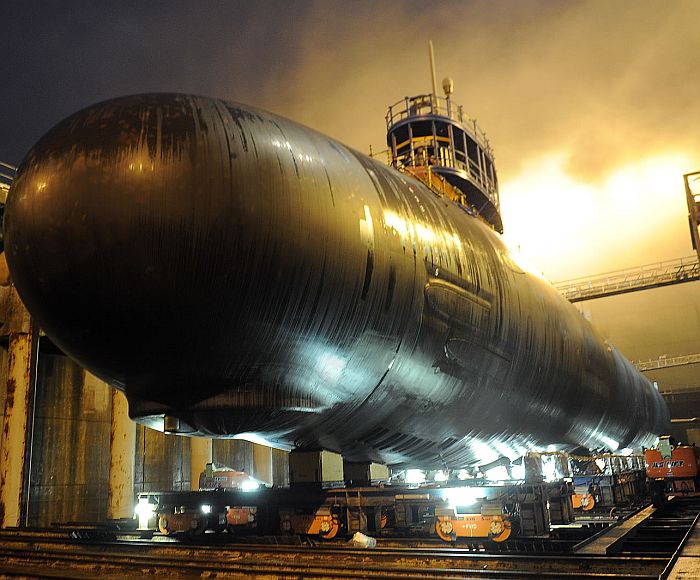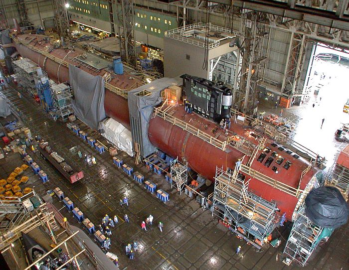 三艘維吉尼亞級正在通用電船的廠區建造;最右側是完成度最高的科羅納多號(USS Colorado SSN-788)正移往沈降式
