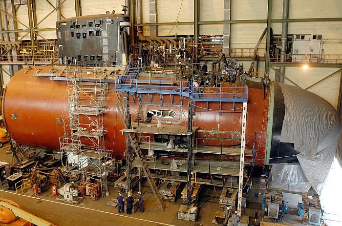 建造中的 維吉尼亞級第三批的伊利諾號(USS Illinois SSN-786)的帆罩部位。可以看到帆罩前部與兩側有許多開口,