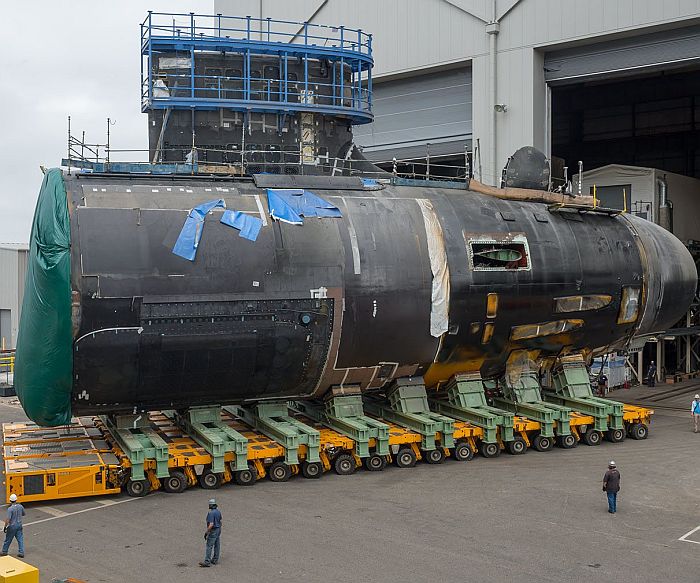 第三批維吉尼亞級的華盛頓號(USS Washington SSN-787)的艦首段(由新港紐斯船廠製造)運抵通用電船後,
