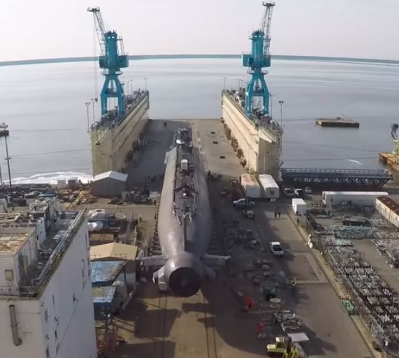 浮動乾塢準備下水,中間是正在建造的佛蒙特號(USS Vermont SSN-792)的部分船段(含艦首),畫面左側則是