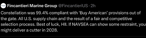 2025年12月20日芬坎提尼集團在X上發佈聲明表達對FF(X)片面選擇HII集團 ,以及先前NAVSEA持續修改星座級設計的不滿。該聲明隨即遭撤下。 在12月20日,芬坎提尼海洋集團(Fincantieri Maringe Group)在其官方X上發文,對於美國海軍部迅速片面決定由HII集團設計建造新巡防艦做出回應,駁斥約翰.費蘭在先前宣布FF(X)視頻中高調宣傳新選擇是「基於成熟的美國設計、美國船廠與美國供應鏈」以及指出「先前美國巡防艦仰賴外國供應鏈」的說法,並暗中對先前星座級專案執行期間美國海軍海上系統司令部(NAVSEA)無止境地變更設計表達不滿。該聲明稱,星座級巡防艦99.4%符合「在美國採辦」(Buy American),完全由美國供應鏈支持,而且是「通過公平且競爭性的選責程序」。聲明最後表示,「祝HII好運,如果NAVSEA展現一些自我克制,你有可能在2028年交付第一艘巡邏艦」。該集團隨即撤下這則聲明。