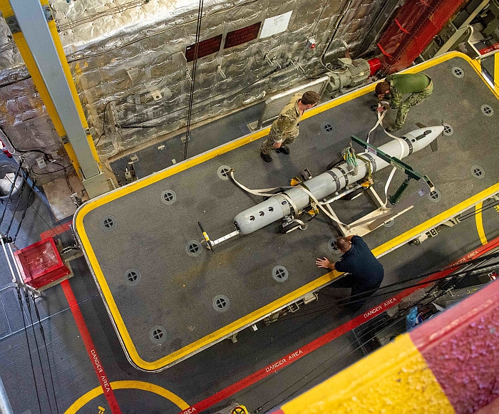 無人水雷探測載具放到升降機上,準備運往上層的直昇機甲板。