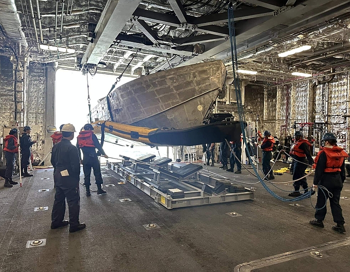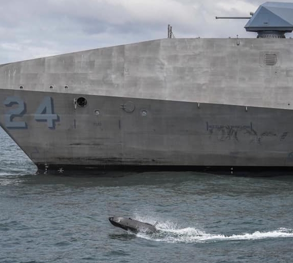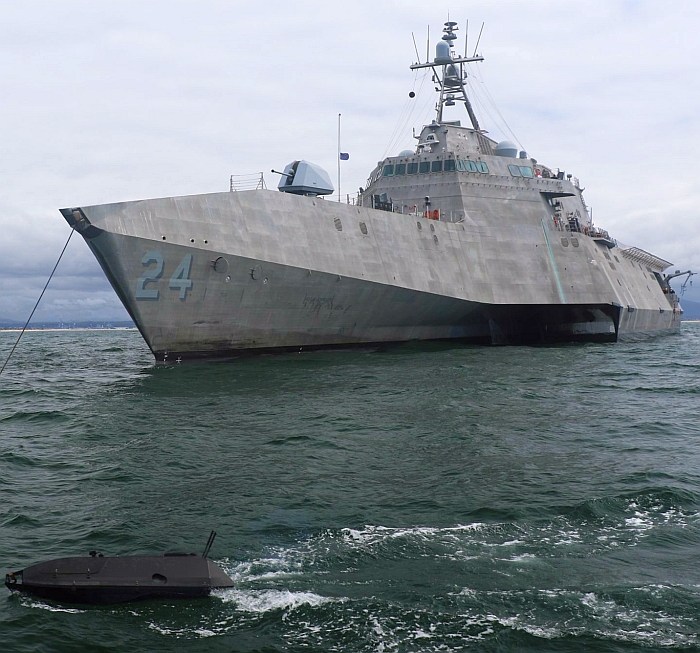 在2021年4月22日無人整合戰鬥課題21(UxS IBP 21)演習期間,剛剛服役7天的 獨立級奧克蘭號(USS Oakland LCS 24)正配合操作ADARO無人水面載具。
