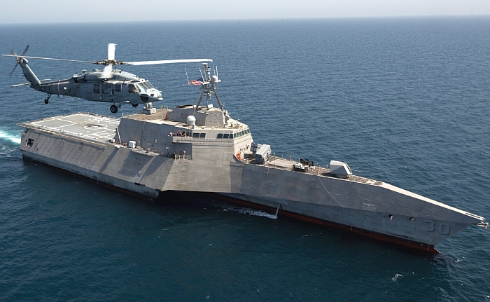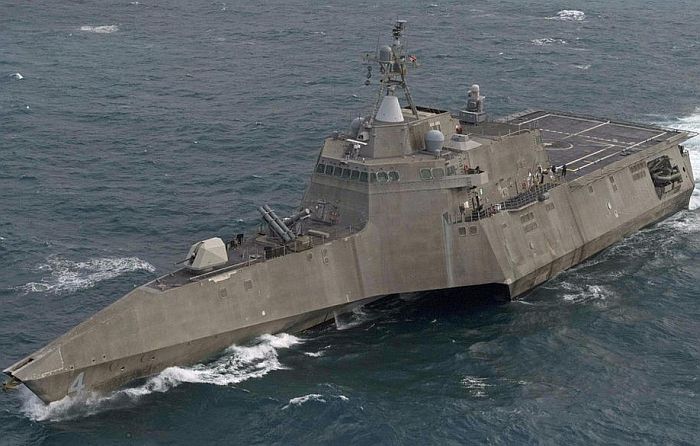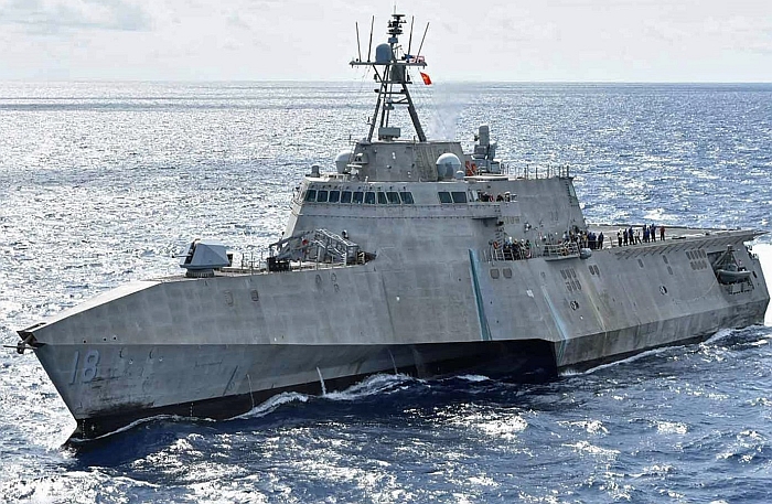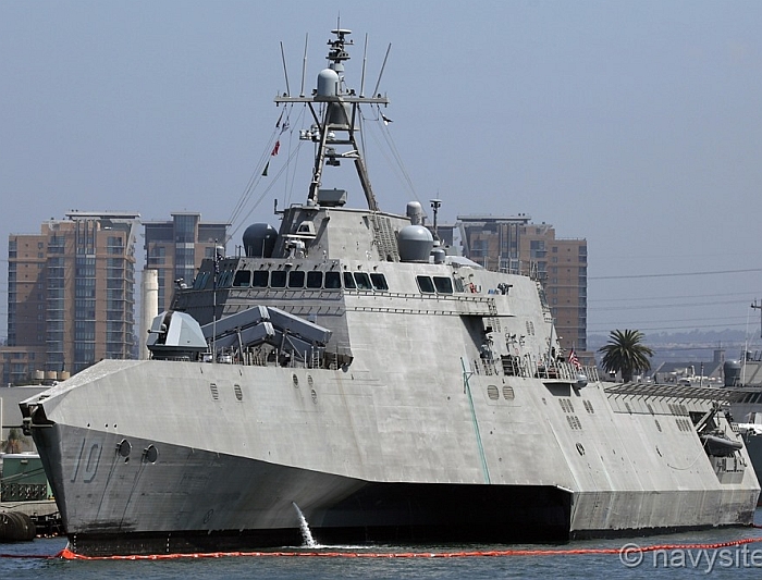 焊接製造鋁合金船體需要很高的工藝,否則成品在日後更快就會破裂毀損;此外,鋁合金在海水中也更容易腐蝕。事實上在過去數年,聖地牙哥的船廠在維修獨立級時,有兩艘同型艦的艦首因為腐蝕過於嚴重而完全切掉更換。 2023年的發展:獨立級與自由級的分配/部署問題 依照2023財年版30年造艦計畫,美國海軍取消LCS的反潛作戰套件,並打算將現役的9艘自由級除役(雖然美國國會隨後通過的國防授權法並不允許海軍一口氣將全部九艘自由級汰除)。這些自由級在除役前,全數駐紮在佛羅里達的梅港(Mayport),在南美洲以及中東部署,專注於反水面作戰(ASuW)任務;而獨立級部署在西岸聖地牙哥專注於太平洋區任務,水雷反制作戰套件也集中到聖地牙哥基地用於獨立級(這些都符合2021年美國海軍的艦隊結構研究結論)。由於太平洋戰區優先度最高,LCS艦隊新增的NSM反艦飛彈也優先裝備於獨立級;這使得除了水雷反制任務之外,LCS艦隊現階段超視距打擊武力也集中在獨立級上。在2022年,自由級LCS的蘇城號(USS Sioux City LCS-11)進行第一次巴林部署,首開LCS部署在中東的紀錄。 2023年1月上旬,美國海軍水面作戰艦隊(Commander of Naval Surface Forces)指揮官羅伊.基奇納中將(Vice Adm. Roy Kitchener)表示,美國海軍考慮前進部署至多2艘獨立級到巴林,其中一艘是水雷反制作戰構型;而同時海軍也考慮其他選項。基奇納說,之前美國海軍考慮在美國西岸部署兩艘獨立級,但現在的構想是將它們直接前進部署在巴林,類似先前部屬復仇者級一樣。在2023年,獨立級辛辛納提號(USS Cincinnati LCS-20)搭載水雷反制套件將形成初始作戰能力(IOC)。 依照2022年11月10日防務新聞(Defense News)報導,美國海軍水面艦隊打算派遣聖地牙哥的獨立級搭載水雷反制套件前往巴林,汰換第五艦隊常駐在巴林的四艘復仇者級(Avenger class)水雷反制艦,接替水雷反制任務;然而,此時太平洋艦隊卻不願意分出獨立級兵力到第五艦隊,因為這會削弱西太平洋的可用武力。近兩年獨立級在太平洋的運用十分成功,例如2021年傑克遜號(USS Jackson LCS-6)在2021年7月到2022年10月前進部署到西太平洋,在南中國海、印度洋執行水面巡邏、查緝不法等水面戰任務,並搭配MQ-8C火斥候無人直昇機。 2023年1月11日水面艦協會2023年年會(Surface Navy Association,SNA2023)中,海軍作戰辦公室負責遠征作戰(expeditionary warfare )的OPNAV N95的主管海軍陸戰隊准將馬克斯.安尼巴爾(Brig. Gen. Marcus Annibale)表示,此時美國海軍的目標是從2025年起將獨立級部署到中央司令部(CENTCOM,負責中東和中亞地區),在2027年部署到印太司令部(INDOPACOM)。而當前在巴林部署獨立級的顧慮在於,巴林基地的基礎設施恐怕無法有效支持獨立級在此部署作業,相形之下自由級是比較好的選項(可能是因為獨立級寬度過大,中東地區能支援的船塢設施受限;此外先前巴林基地對於部署LCS的重心都放在自由級上)。 此時,約有10艘獨立級部署在聖地牙哥,美國海軍希望任何時間都能有三艘獨立級部署在西太平洋。由於太平洋戰區優先度較高,美國海軍可能無法如願將獨立級派到中東,美國海軍只好考慮其他方法接替屆齡的復仇者級。2023年1月11日,羅伊.基奇納中將在水面艦協會2023年年會(Surface Navy Association,SNA2023)表示,美國海軍今年打算部署三艘自由級,其中兩艘到南美洲,一艘到巴林去支援第五艦隊。此時,自由級專注在水面作戰任務,並沒有整合水雷反制套件,但基奇納中將表示還有其他可能選項;例如,2022年自由級的蘇城號部署到巴林時,曾實驗性地搭載遠征水雷反制單位(ExMCM)作業;因此,雖然自由級本身沒裝備水雷反制套件,但還是能支援水雷反制作戰任務。 LCS殺傷力與生存性升級(L&S)(2024年起) 依照2023年6月20日美國海軍主管採辦的助理部長Frederick Stefany送交國會的報告,LCS準備進行的殺傷力與生存性(Lethality and Survivability,L&S)升級,計畫為兩種LCS上進行共通的升級,將原本某些承包商裝修(contractor-furnished)裝備換成政府裝修裝備(government-furnished equipment),移除一些非政府正式採辦項目(non-Program of Record,non-POR)設備。這些措施能讓LCS的服役情況更加可靠,並藉由政府採辦項目(POR)更堅實的維持保障網路,繼續有效服役10至20年。 LCS的L&S分為兩個階段升級:第一階段(Phase 1)包括換裝共通的戰鬥管理系統(統一成洛馬集團的COMBATSS-21)、整合與測試新的艦砲武器系統(Gun Weapon System,GWS)、輕量化的AN/SLQ-32(V)6 SEWIP Block 2C電子戰系統(SEWIP Light)、MK-53 Nulka有源式誘餌等、強化的資料鏈系統等。而進一步的Phase 2升級包括整合NSM反艦飛彈(在L&S展開之前,獨立級已經陸續加裝NSM反艦飛彈)、RAM Block 2B短程防空飛彈、通用航空指揮管制系統(Common Aviation Command and Control System )、無人水面船艦控制系統(unmanned surface vessel control)等。 依照2024財年預算,獨立級從2024財年起會陸續配合維修工程進行L&S升級,第一艘進行的是2024財年排定維修週期的嘉貝麗.吉福茲號(USS Gabrielle Giffords LCS-10),最後一艘是排定2038財年升級的皮埃爾號(USS Pierre LCS-38)。自由級目前還沒有排入LCS Phase 1升級,而海軍正在評估升級自由級的成本。 在2025年1月15日美國海軍水面船艦協會年會(Surface Navy Association,SNA 2025)上,美國海軍上校JJ Murawski透露,在首艘進行L&S升級的嘉貝麗.吉福茲號(USS Gabrielle Giffords LCS-10)之後,2025財年中排定進行L&S升級的獨立級包括曼徹斯特號(USS Manchester LCS-14)與查爾斯頓