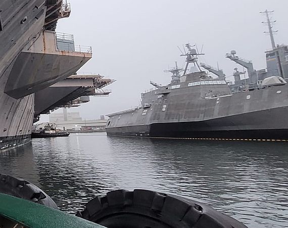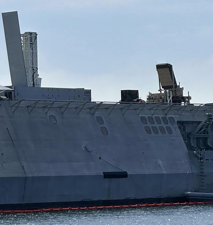 加布里埃爾.吉福茲號(USS Gabrielle Giffords LCS-10)在2019年9月3日離開聖地牙哥軍港 前往西太平洋部署的照片,艦首新增了兩組雙聯裝NSM反艦飛彈發射器 (此時只裝備兩枚實彈)。