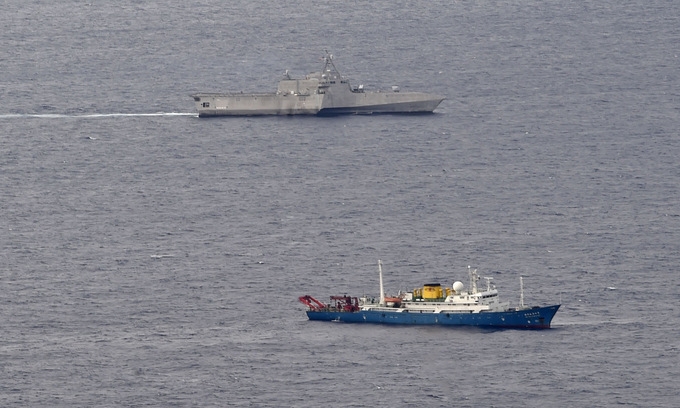 (上與下)2020年7月2日,布里埃爾.吉福茲號(LCS-10)在南中國海實施航行自由任務,曾接近在附近作業的中國