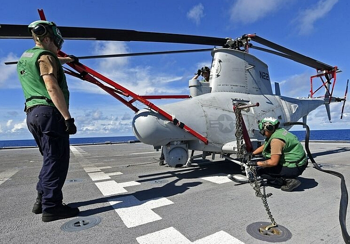 查爾斯頓號(USS Charleston LCS-18)在操作MQ-8B火斥候無人直昇機。