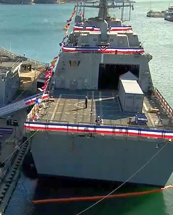 俯瞰獨立級的查爾斯頓號(USS Charleston LCS-18),艦首裝備兩組四聯裝NSM反艦飛彈發射器。