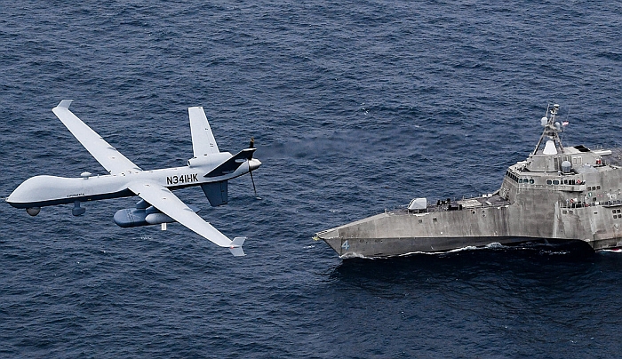 在2021年4月21日無人整合戰鬥課題21(UxS IBP 21)演習期間,一架MQ-9海衛無人機飛過獨立級科羅納多號