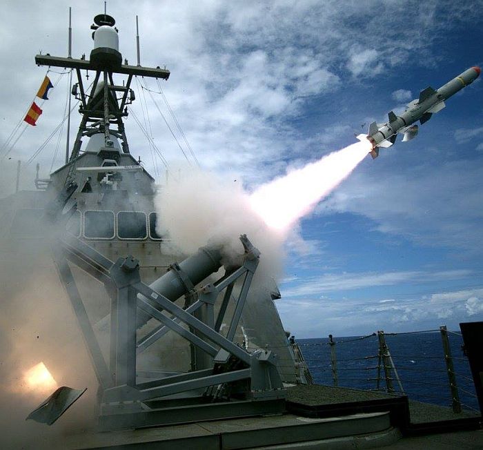 發射魚叉Block 1C反艦飛彈的瞬間。這是LCS首次發射魚叉反艦飛彈,臨時性安裝在 科羅納多號艦首B砲位的預留空間 ;