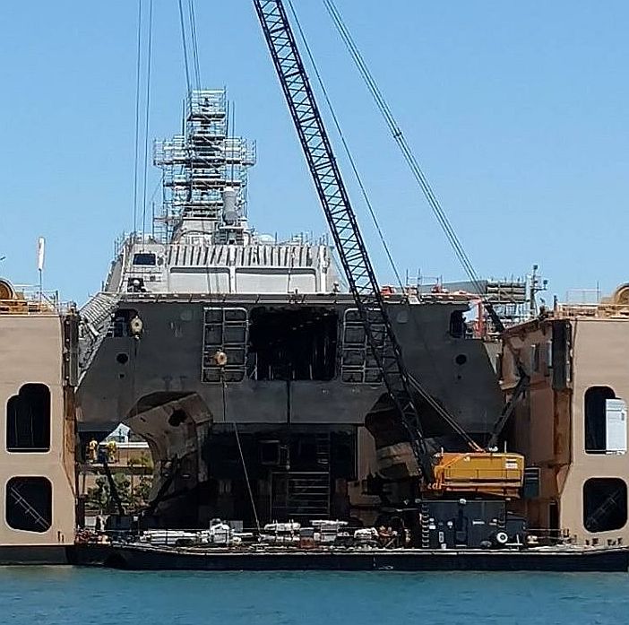 在BAE System位於聖地牙哥的廠區的浮動船塢中的獨立級四號艦蒙哥馬利號(USS Montgomery LCS-8),